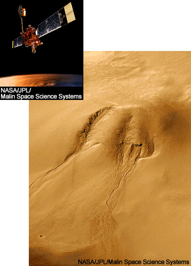現在の火星の表面には、液体の水をたたえる海や川はありません。しかし、水が流れて浸食したような地形が数多く残されています。これはかつて、火星表面に大量の水があったことを物語っています。しかし、火星は地球よりも小さくその重力も小さかったため、蒸発して宇宙に逃げてしまったか、地球よりも寒冷な気候のために地下に氷結してしまったと考えられています。近年、アメリカが打ち上げた火星探査車「オポチュニティ」と「スピリット」によって、水があった環境下で作られたと考えられる鉱物も発見され、また、アメリカが打ち上げた探査機「マーズ・グローバル・サーベイヤー」の撮影した火星表面の写真から、ここ数年で新たに作られたと見られる地下水がしみ出して地表面を流れたような地形が見つかりました。このことから、火星には昔大量の水があり、現在でも地下には氷の形で存在し続けていることが、ほぼ確実視されています。