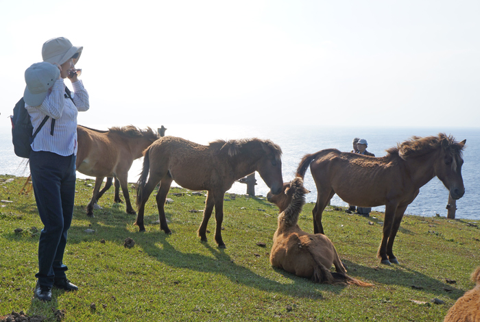東崎灯台下の草原はヨナグニ馬の自然放牧が行われており観光客はその傍に行くことが許されていた。馬たちは近くに行っても悠々としていたが、さすがに突然観光客がおおぜい寄ってきたためか驚いて(私には恥ずかしそうに見えたが)ゆったりと少し離れたところへ逃げ出した。