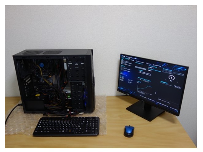 配線が間違いない場合は、DisplyにUEFI画面(いわゆる旧来の教科書にあったBIOSに相当する画面)が現れます。この画面を見れば、CPUや、CPUクーラーファンの回転数、CPU温度、メモリ、SSD、DVDドライブ等が正常に認識されているか確認できます。
